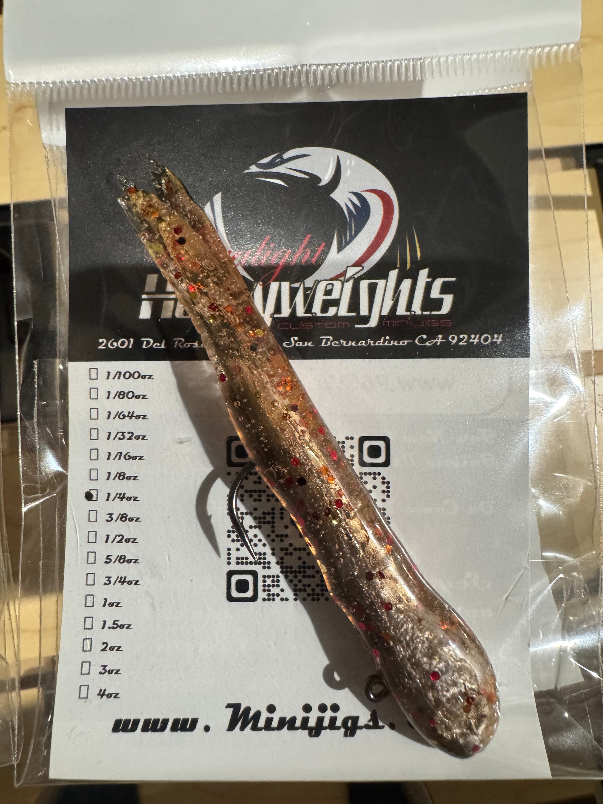 Bigger Tube bait by Ultralight Heavyweights that can be used for various fishing applications like Bay Fishing for Spotties, Calico, or Halibut. Can also be used for very large trout like Pyramid Lake Nevada Cutthroat, or even Largemouth bass.